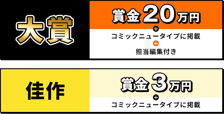 商業誌もしくは商業媒体で未発表の完成済みオリジナル作品(ネームや下描きではご応募いただけません)
