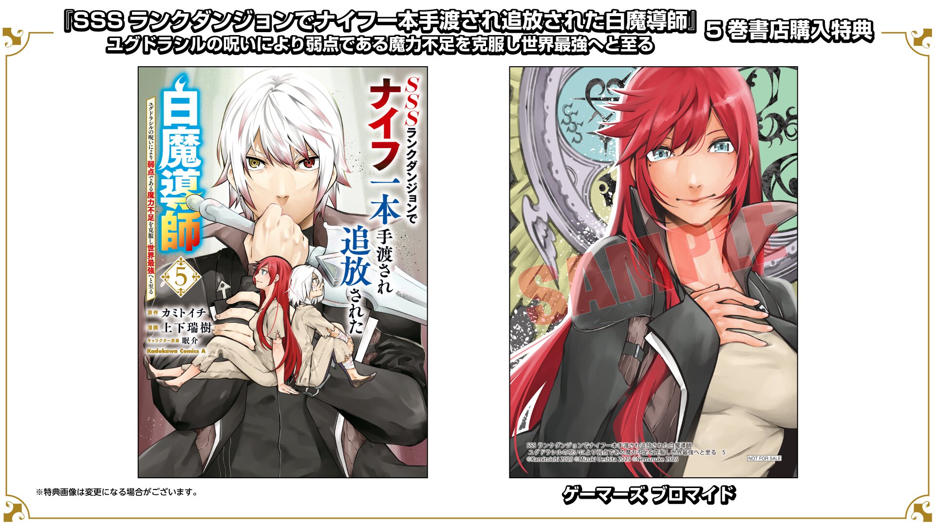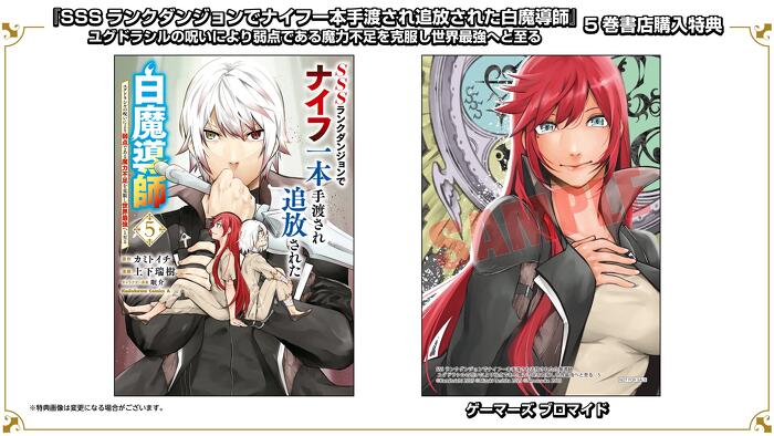 • 『SSSランクダンジョンでナイフ一本手渡され追放された白魔導師 ユグドラシルの呪いにより弱点である魔力不足を克服し世界最強へと至る』5巻 書店購入特典一覧