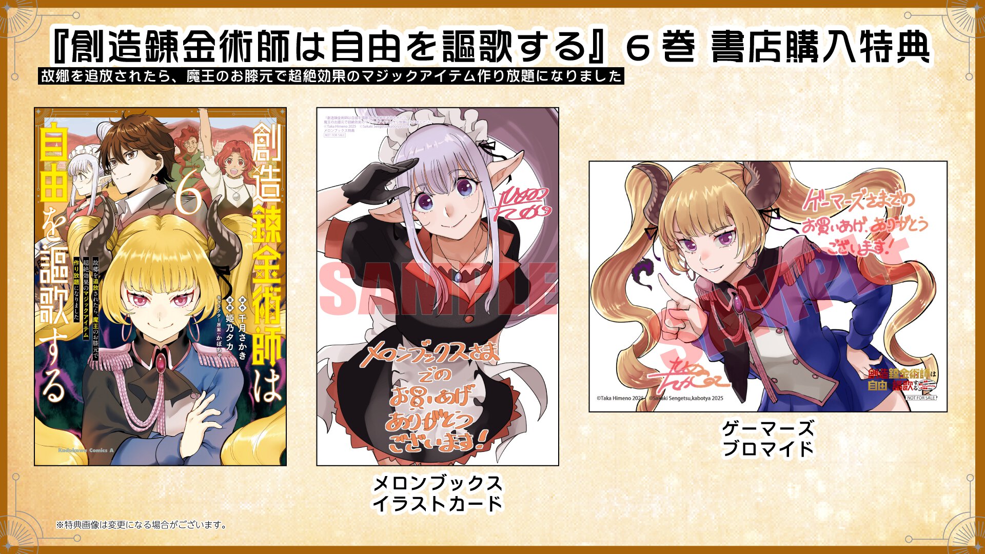『創造錬金術師は自由を謳歌する 故郷を追放されたら、魔王のお膝元で超絶効果のマジックアイテム作り放題になりました』6巻 書店購入特典一覧