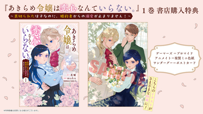 • 『あきらめ令嬢は恋心なんていらない。~裏切られたはずなのに、婚約者からの溺愛が止まりません!~』1巻 書店購入特典一覧